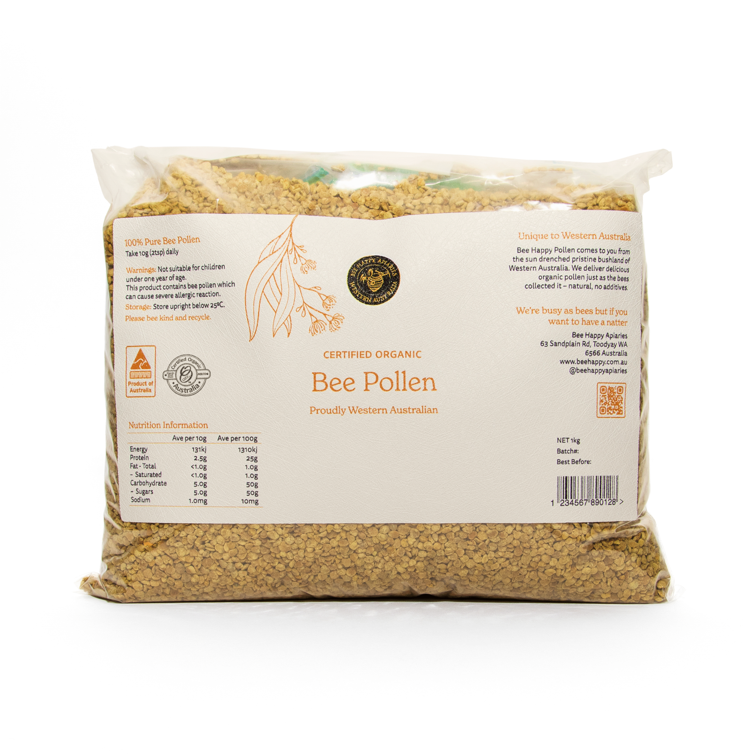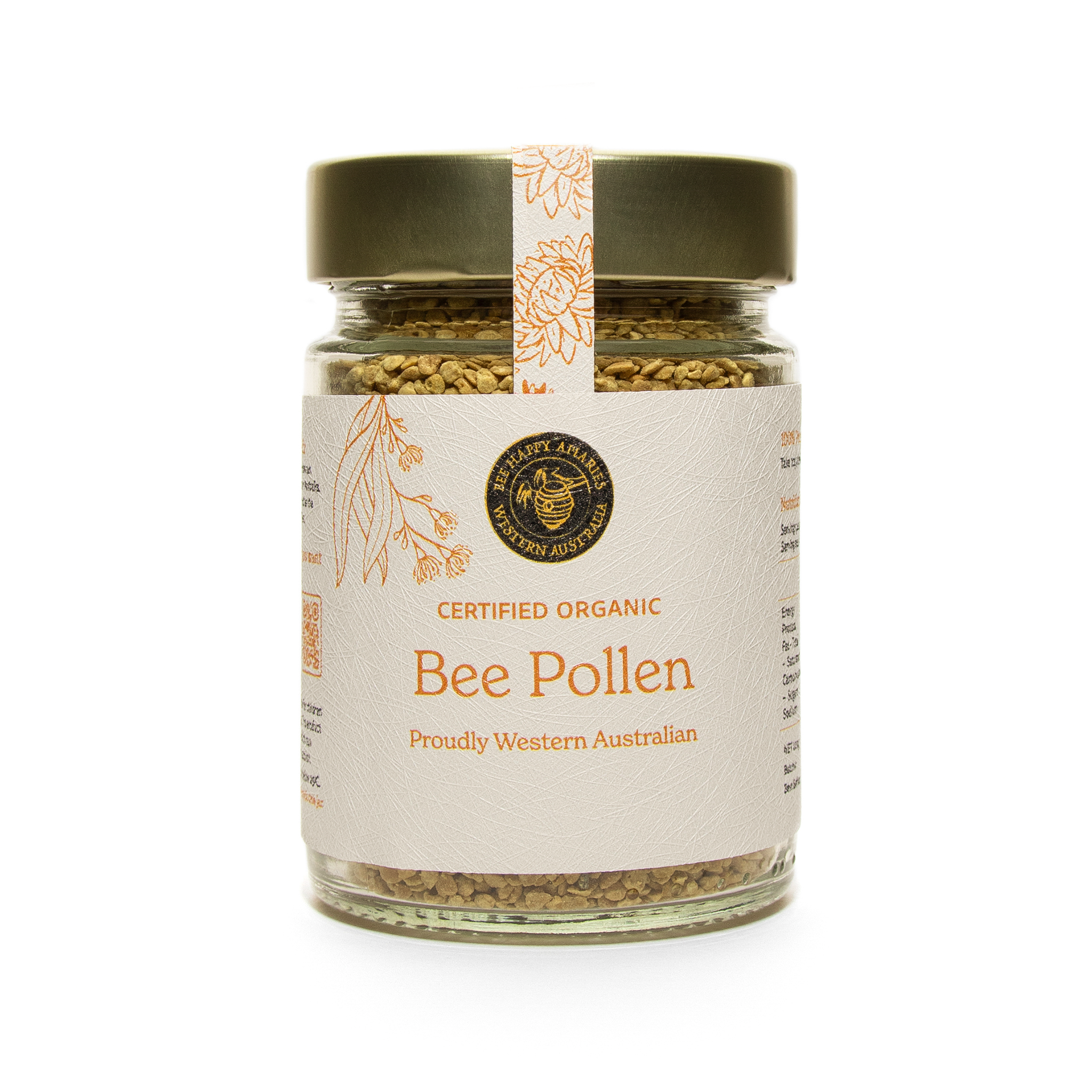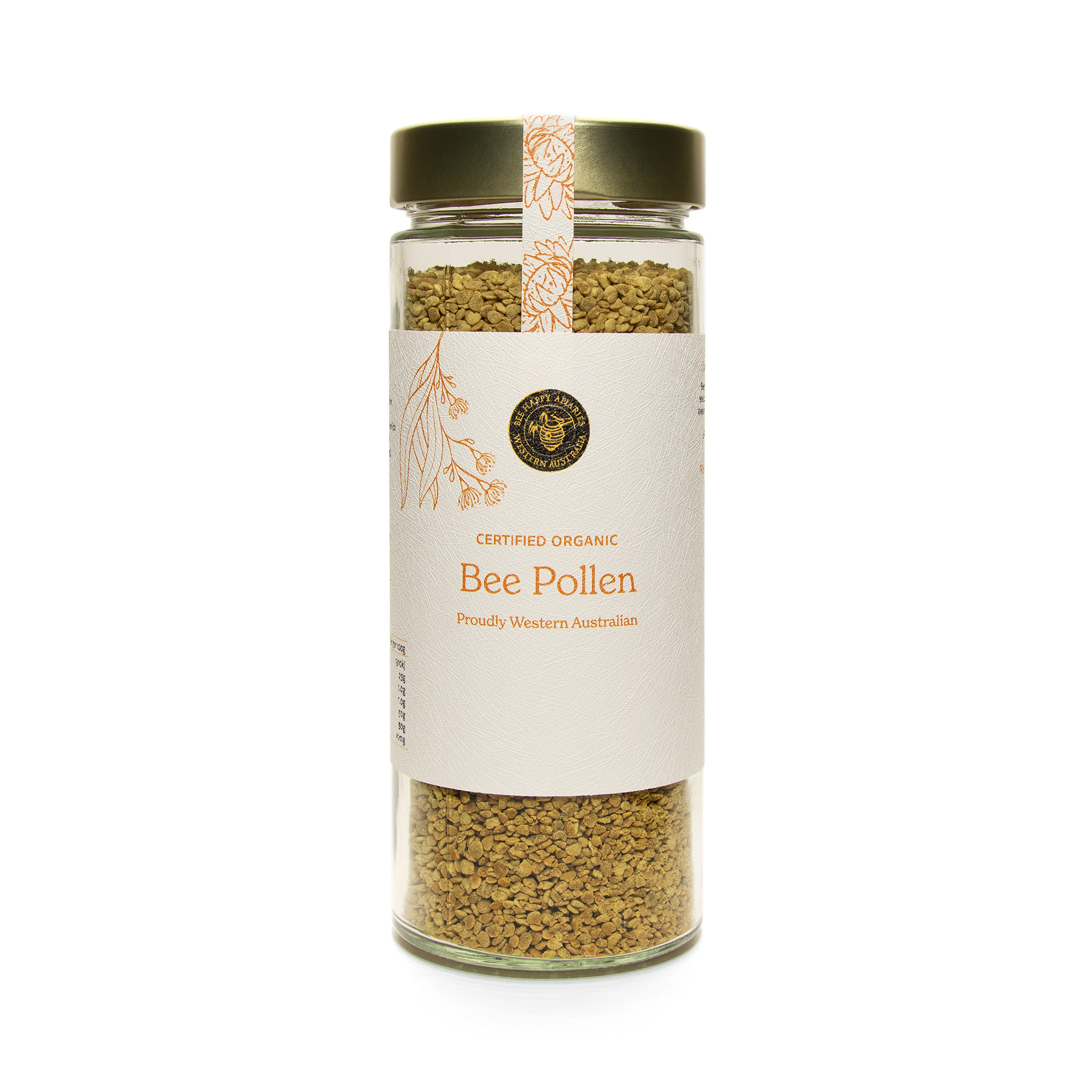 Bee Happy Bee Pollen is collected in pristine regions of Western Australia, where diverse native flora contributes to its rich nutritional profile. Each teaspoon contains billions of pollen grains, gathered by bees with remarkable effort — one bee takes a full month of work to collect just one dose. Carefully harvested and Certified Organic, our bee pollen is a powerhouse of plant-based nutrients designed to support your energy, immunity, and overall vitality.