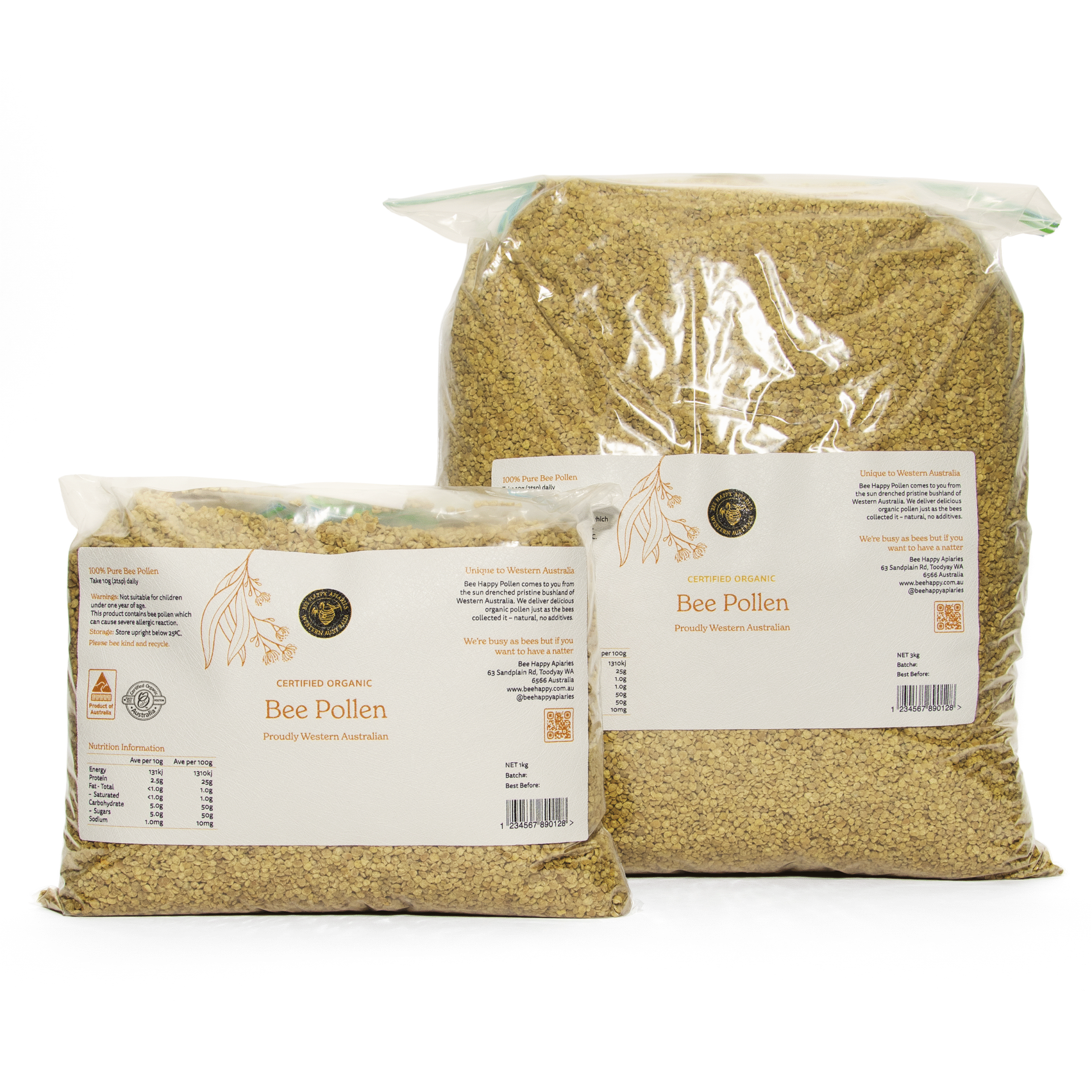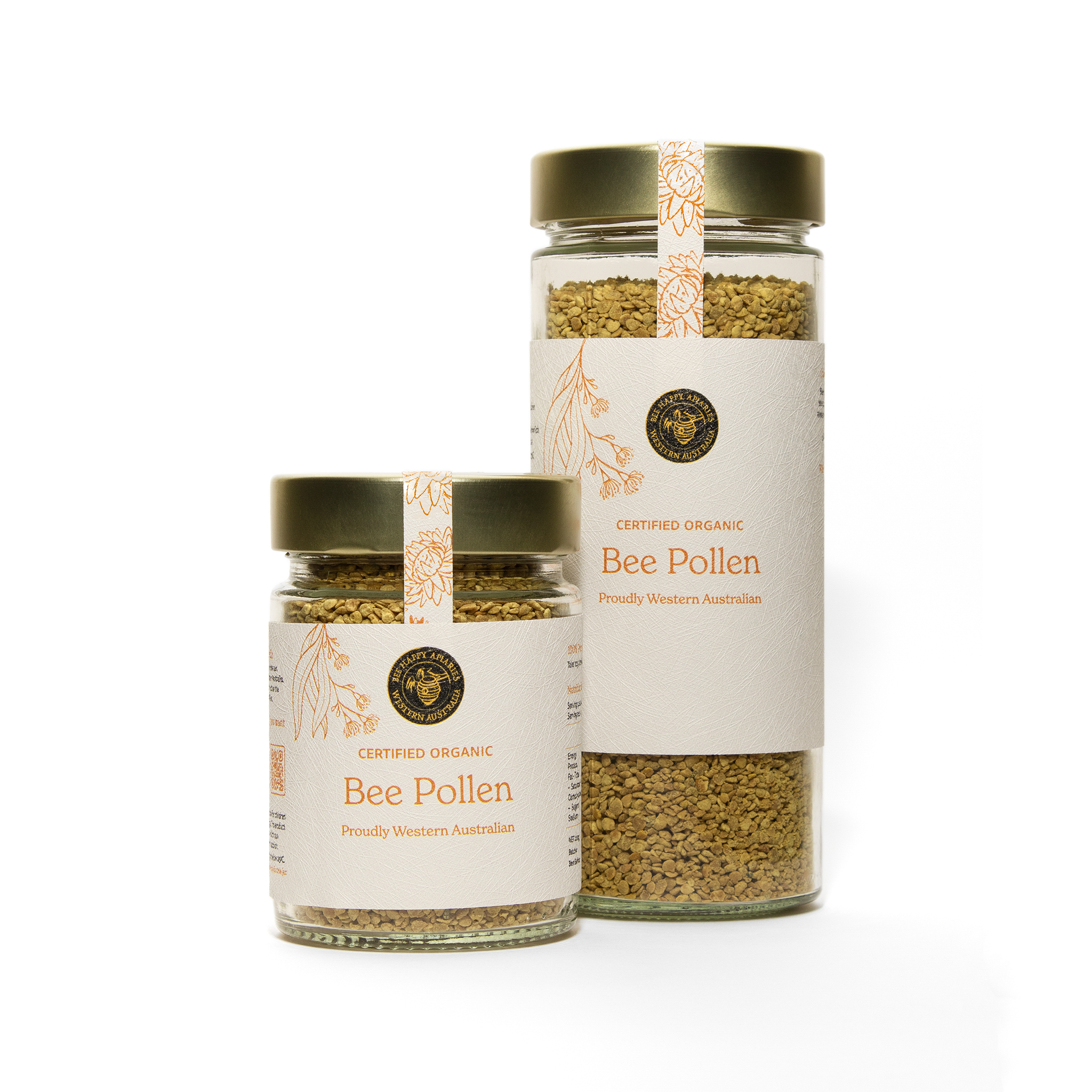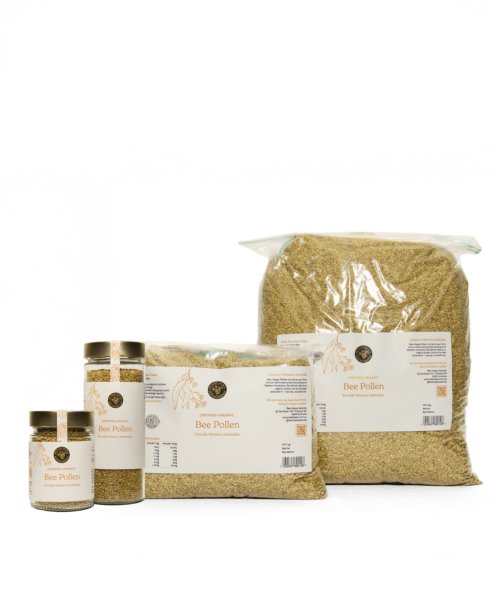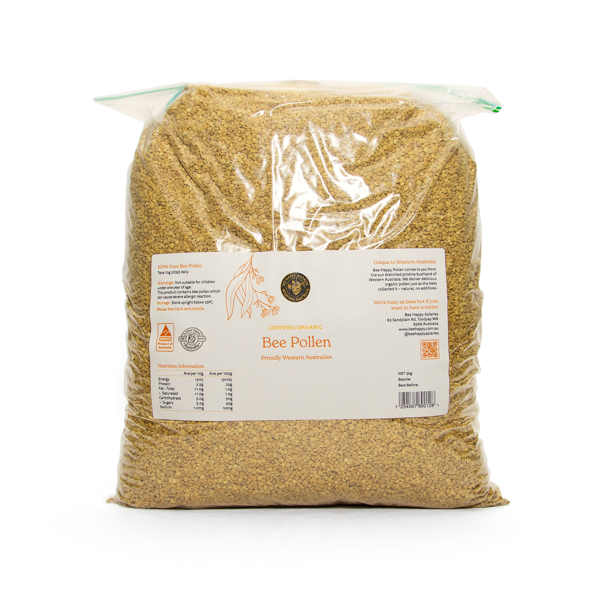 Bee Happy Bee Pollen is collected in pristine regions of Western Australia, where diverse native flora contributes to its rich nutritional profile. Each teaspoon contains billions of pollen grains, gathered by bees with remarkable effort — one bee takes a full month of work to collect just one dose. Carefully harvested and Certified Organic, our bee pollen is a powerhouse of plant-based nutrients designed to support your energy, immunity, and overall vitality.