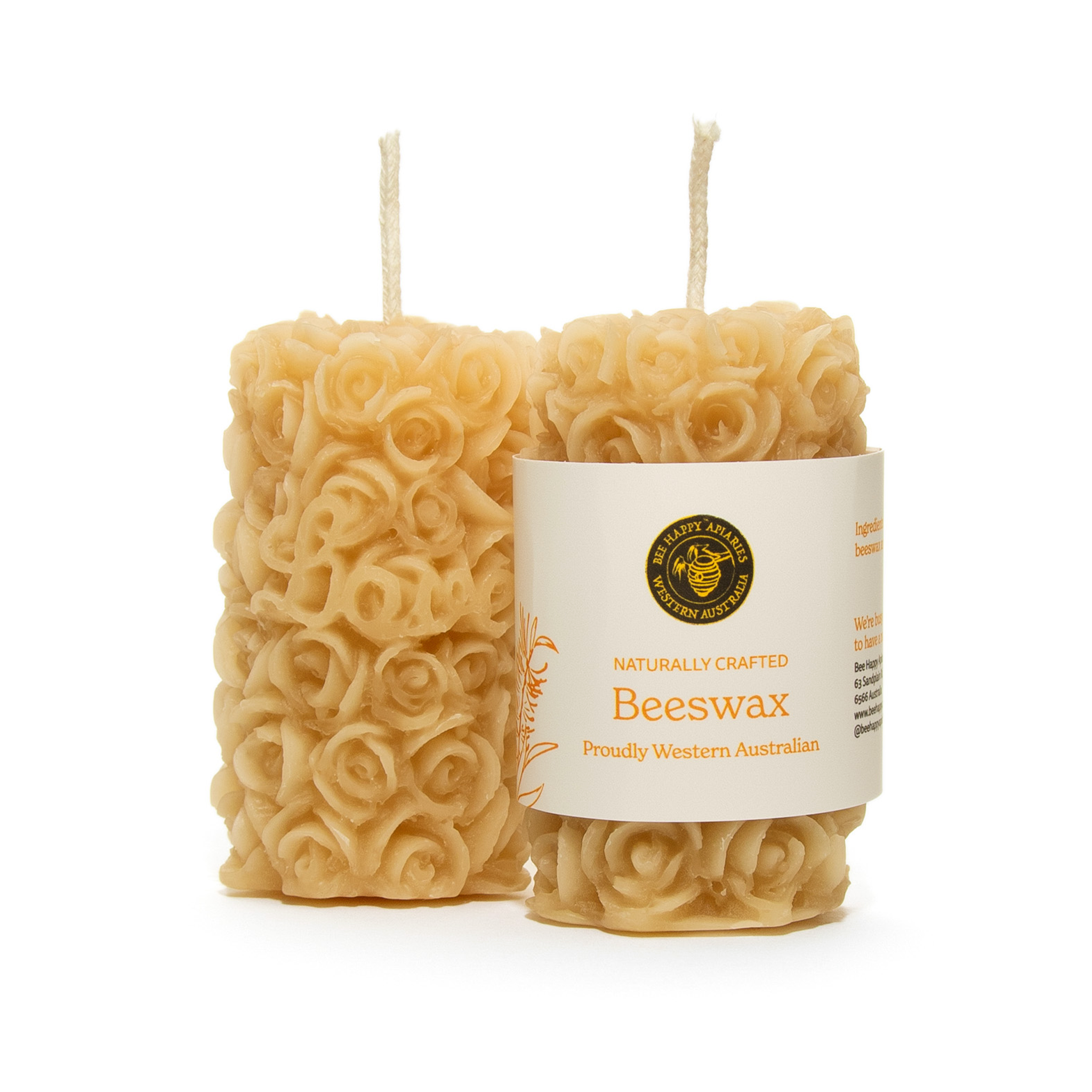 Bee Happy Pure Beeswax Small Round Rose Candles come in a sweet 2-pack, each handcrafted in a delicate rose design that adds a touch of charm to any space. Measuring 7cm long by 4cm wide, these petite candles are made from 100% pure Western Australian beeswax and give off a warm, gentle glow with a soft, honey-sweet scent. Perfect for gifting, decorating, or creating a calming atmosphere, they’re a beautiful natural alternative to synthetic candles. Approximate burn time is 5 hours each.